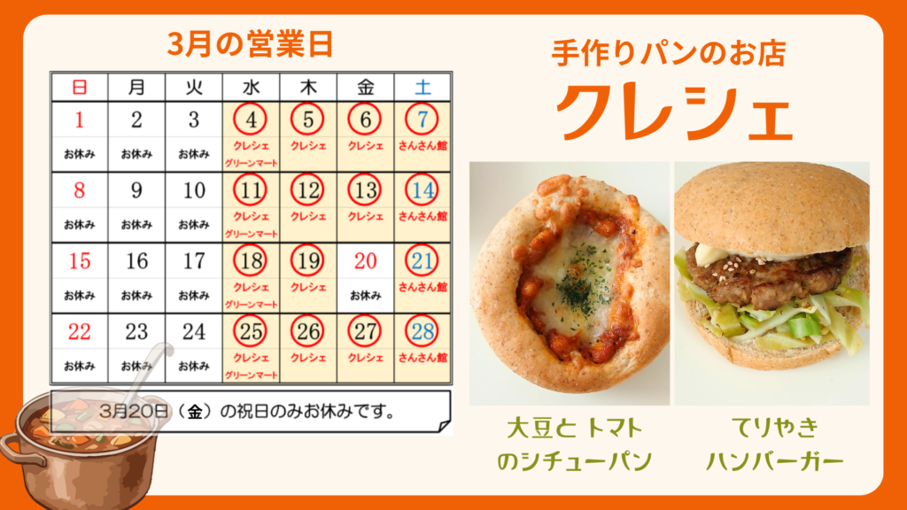 「クレシェ」2026年3月の営業日 2026.02.27 昨年、パン工房は4人のスタッフさんが増えました。毎日とても賑やかです。 フレッシュな雰囲気が毎月の新発売にも繋がっています!! ◆1条通クレシェで販売水曜・木曜・金曜日 11時~ (3/4,5,6,11,12,13,18,19,25,26,27) ◆さんさん館カフェでの販売 土曜日 11時~ (3/7,14,21,28) ◆グリーンマートinつべつ さんで販売(惣菜コーナー)水曜日 10時30分~ (3/4,11,18,25) 3/20(金)は祝日のためお休みとなります!
